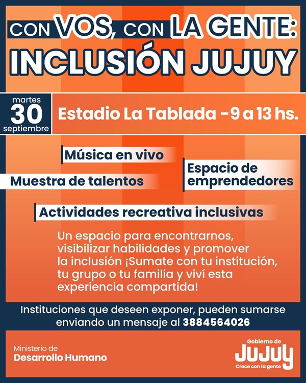 El Ministerio de Desarrollo Humano, a través del Gobierno de la Provincia invita a toda la comunidad a participar de la jornada “Con vos, con la gente: Inclusión Jujuy”, que se desarrollará el martes 30 de septiembre de 9 a 13 horas en el Estadio La Tablada.