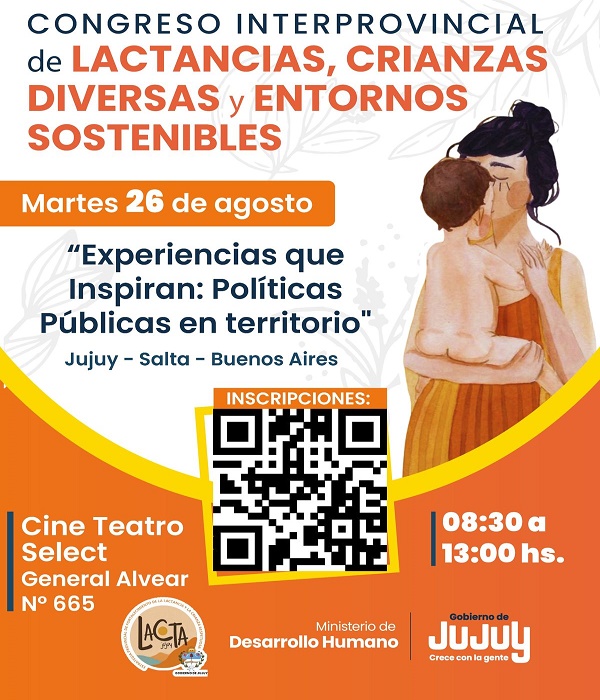 El Gobierno de la Provincia de Jujuy, a través del Ministerio de Desarrollo Humano y la Coordinación de Gestión de Gobernación, invita a participar del Congreso Interprovincial de Lactancias, Crianzas Diversas y Entornos Sostenibles, que se llevará a cabo los días 25, 26 y 27 de agosto de 2025 en la ciudad de San Salvador de Jujuy.