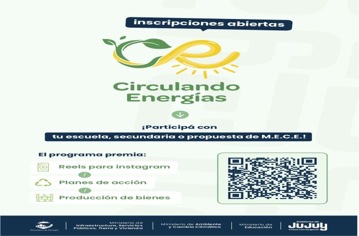 El Gobierno de Jujuy, a través de los Ministerios de Infraestructura, Servicios Públicos, Tierra y Vivienda (MISPTyV), de Educación y de Ambiente y Cambio Climático, informa que se encuentran abiertas las inscripciones para participar del Programa «Circulando Energías», e impulsado por la Secretaría de Energía del MISPTyV.