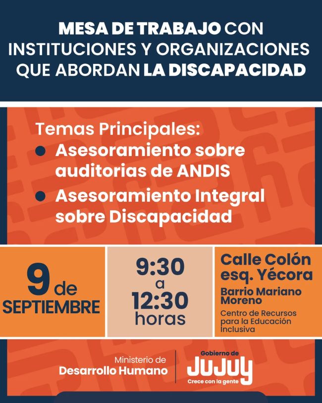 El Ministerio de Desarrollo Humano de Jujuy, a través de la Secretaría de Desarrollo Integral y la Dirección Provincial de Inclusión de Personas con Discapacidad, convoca a instituciones y organizaciones que trabajan en la temática a participar de una nueva Mesa de Trabajo, que tendrá lugar el próximo martes 9 de septiembre, de 9:30 a 12:30 horas, en el Centro de Recursos para la Educación Inclusiva, ubicado en calle Colón esquina Yécora del barrio Mariano Moreno en San Salvador.