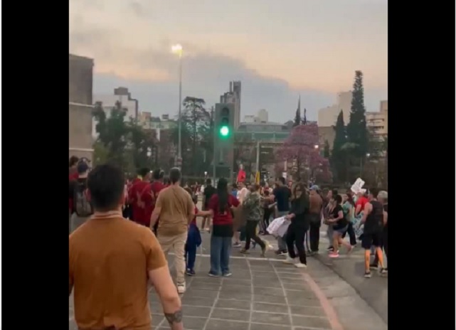 El enfrentamiento, protagonizado por manifestantes del Polo Obrero (PO) y de un grupo de adherentes a La Libertad Avanza (LLA) con remeras de color bordó con la leyenda “Las Fuerzas del Cielo”, se produjo en la Plaza España alrededor de las 19.