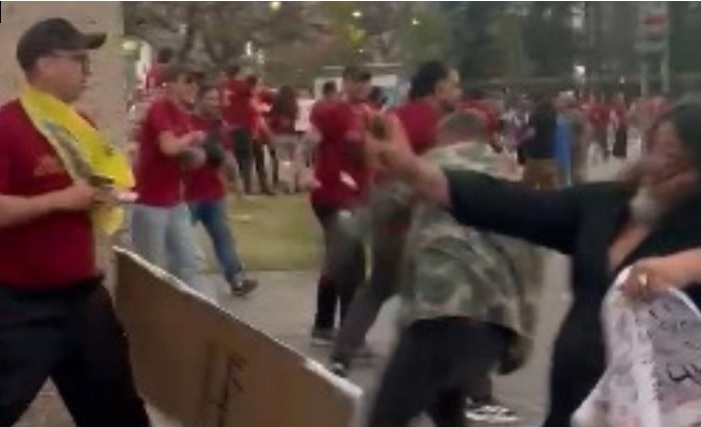 Manifestantes del Polo Obrero y La Libertad Avanza, que usaban remeras bordó con la leyenda “Las Fuerzas del Cielo”, se agredieron con golpes de puño, palos, botellas y gas pimienta. Fue antes del acto de Milei.