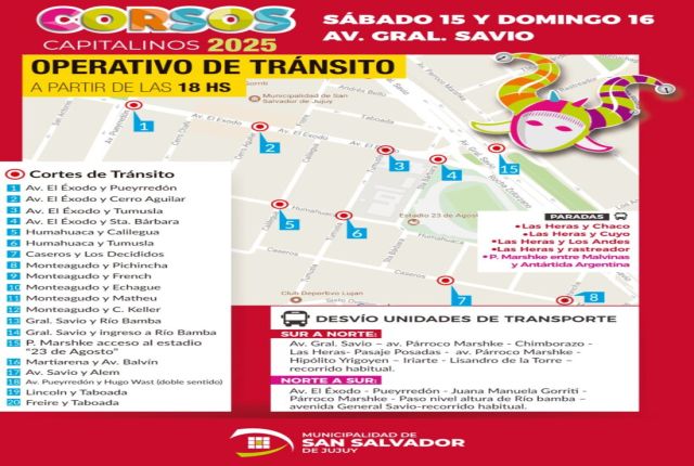 La Secretaría de Servicios Públicos de la Municipalidad de San Salvador de Jujuy informa a la comunidad, en especial a los usuarios del transporte urbano de pasajeros, que los días sábado 15 y domingo 16 de febrero, con motivo de los tradicionales corsos que se realizarán en la avenida Gral. Savio, se implementarán modificaciones en los recorridos de las líneas de transporte público.