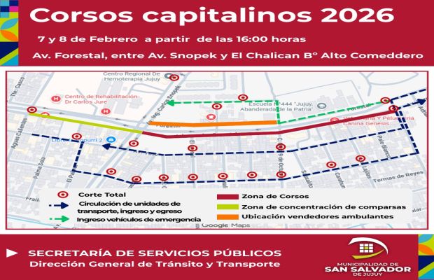 La Secretaría de Servicios Públicos, a través de la Dirección de Tránsito y Transporte, informa a la población en general y a los usuarios del transporte urbano de pasajeros en particular, que por llevarse a cabo los próximos días sábado 7 y domingo 8 de febrero, los tradicionales corsos en Av. Forestal en el barrio Alto Comedero, se dispuso que líneas de colectivos modifiquen su recorrido llegando al lugar del evento donde las paradas estarán debidamente identificadas.