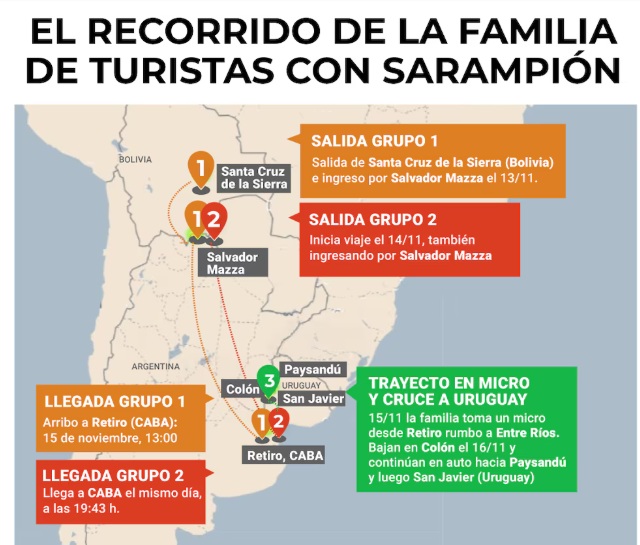 La familia, integrada por seis personas de nacionalidad rusa radicadas en San Javier (Uruguay), ingresó a Argentina proveniente de Bolivia el 14 de noviembre y cruzó a Uruguay desde Colón (Entre Ríos) el 16, permaneciendo en territorio argentino durante aproximadamente 48 horas. Ninguno de los miembros había recibido la vacuna contra el sarampión.