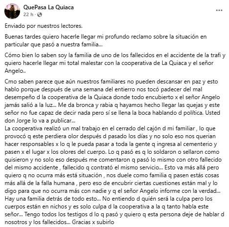 Luego continúa relatando, “cómo bien lo saben soy la familia de uno de los fallecidos en el accidente de la trafic y quiero hacerle llegar mi total malestar con la Cooperativa de La Quiaca y el señor Ángelo”.