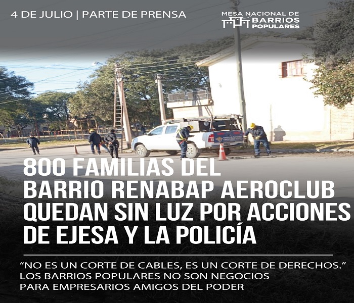 En el día de ayer jueves 3 de julio, en plena ola polar que atraviesa nuestro País más de 800 familias del barrio RENABAP Aeroclub en Jujuy fueron dejadas sin energía eléctrica, luego de que operarios de EJESA (Empresa Jujeña de Energía), acompañados por efectivos policiales, cortaron los cables que les brindaban servicio de manera precaria.