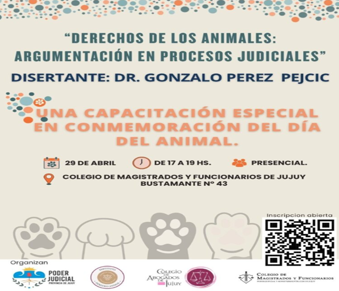 En el marco de la conmemoración del Día del Animal, se llevará a cabo la capacitación sobre “Derechos de los Animales: Argumentación en Procesos Judiciales”, que contará con la disertación del Dr. Gonzalo Pérez Pejcic.