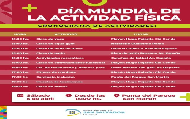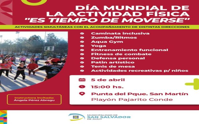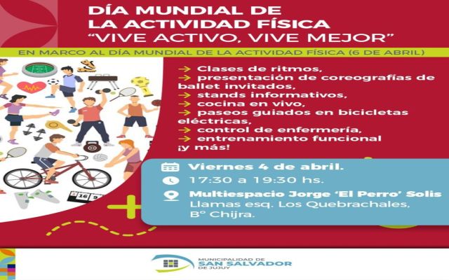 En el marco del Día Mundial de la Actividad Física, que se conmemora cada 6 de abril según lo establecido por la Organización Mundial de la Salud, la Municipalidad de San Salvador de Jujuy llevará a cabo una jornada denominada “Vive Activo, Vive Feliz”.