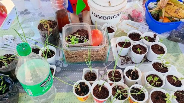 El equipo técnico desplegó un stand interactivo con almácigos de hortalizas y organizó juegos para enseñar sobre el cultivo de plantas. Además, explicaron el proceso de elaboración y las ventajas del lombricompuesto como abono natural.