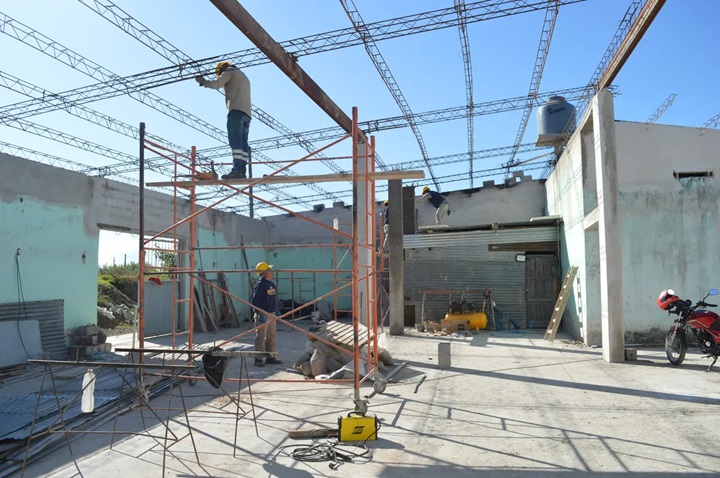 Los equipos, conformados por cooperativistas, intervienen en la cubierta, corrigiendo la estructura metálica con reutilización de piezas en buen estado y la incorporación de nuevas. Una vez finalizada esta instancia, procederán a trabajos de pintura e instalación de chapas.