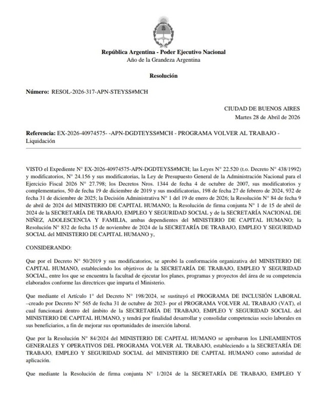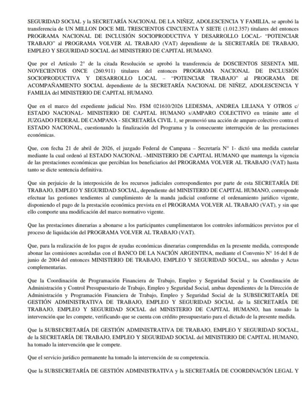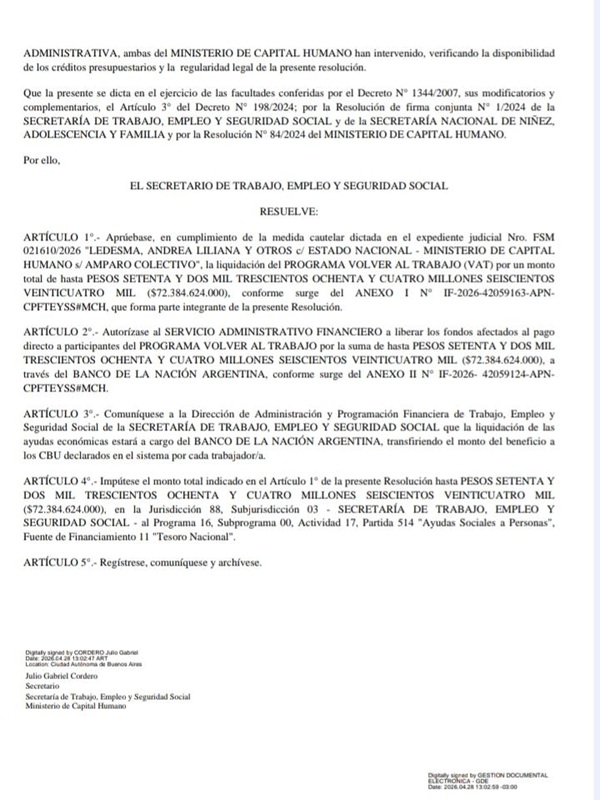 Luego de conocerse a favor esta medida cautelar en la causa «Ledesma, Andrea Liliana y otros c/ Estado Nacional», la Secretaría de Trabajo, Empleo y Seguridad Social se aprobó nuevamente la liquidación del Programa Volver al Trabajo por $ 72.384.624.000.