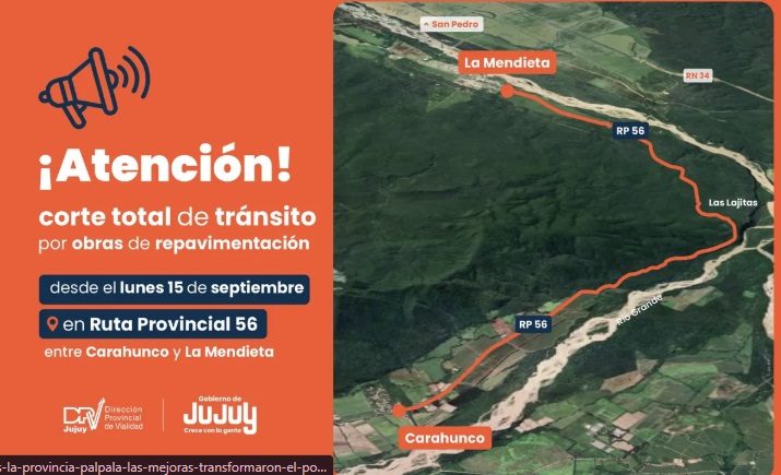 A partir de este lunes, la Ruta Provincial 56 (RP 56) cerrará completamente al tránsito entre las localidades de Carahunco y La Mendieta debido a las obras de repavimentación, en el marco del programa provincial Jujuy Construye.