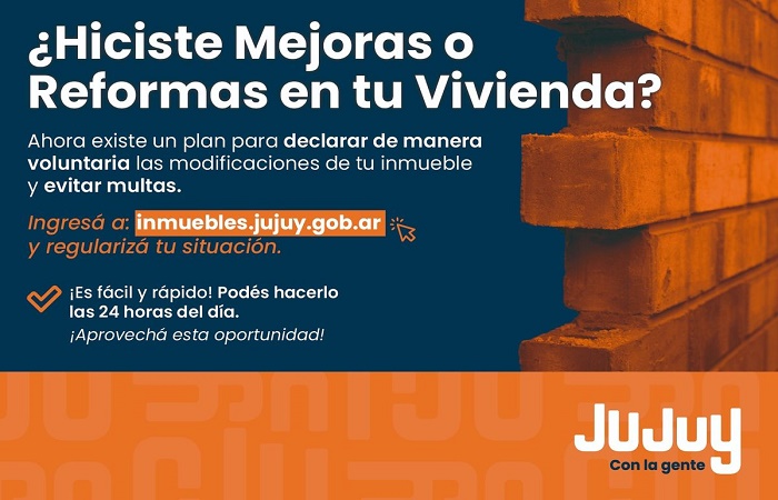 La Dirección Provincial de Inmuebles comunica que rige un plan de “Declaración Voluntaria de Mejoras” para que titulares registrales y poseedores a titulo de dueños, puedan facilitar información de modificaciones o nuevas construcciones concretadas a sus inmuebles, mediante un formulario web.