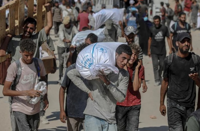 Un video filmado esta semana mostró cómo dos camiones que ingresaban al sur de Gaza fueron literalmente desbordados por multitudes.