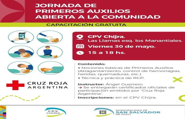 La Municipalidad de San Salvador de Jujuy, a través de la Secretaría de Desarrollo Humano, invita a la comunidad a participar de una capacitación gratuita en primeros auxilios, destinada a vecinos y vecinas interesados en adquirir conocimientos básicos para actuar ante situaciones de emergencia.