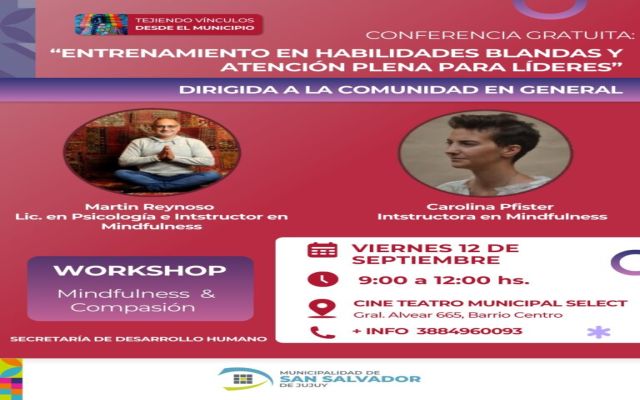 La Dirección de Salud Integral y Género junto a la Dirección de Programas Nacionales de la Municipalidad de San Salvador de Jujuy invitan al público en general a participar de la conferencia gratuita “Entrenamiento en habilidades blandas y atención plena para líderes”, que se llevará a cabo el viernes 12 de septiembre en las instalaciones del Cine Select, de 9 a 12 horas.
