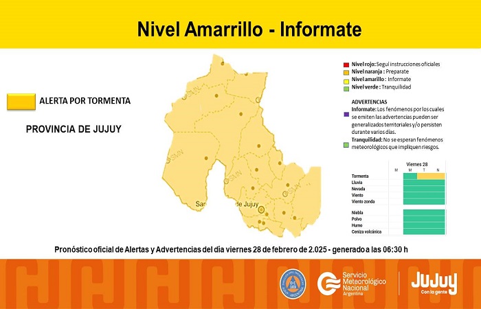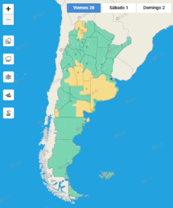 El mismo indica que el área será afectada por tormentas, algunas localmente fuertes. Las mismas podrán estar acompañadas por abundante caída de agua en cortos períodos, frecuente actividad eléctrica, caída de granizo y ráfagas intensas que pueden exceder los 60 km/h.