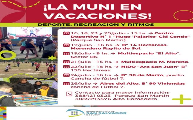 En el marco de la temporada invernal, la Municipalidad de San Salvador de Jujuy, a través de la Dirección de Deporte y Recreación, pondrá en marcha el programa “La Muni en Vacaciones”, una propuesta gratuita destinada a que las familias jujeñas disfruten de jornadas recreativas con juegos, peloteros y actividades para todas las edades.