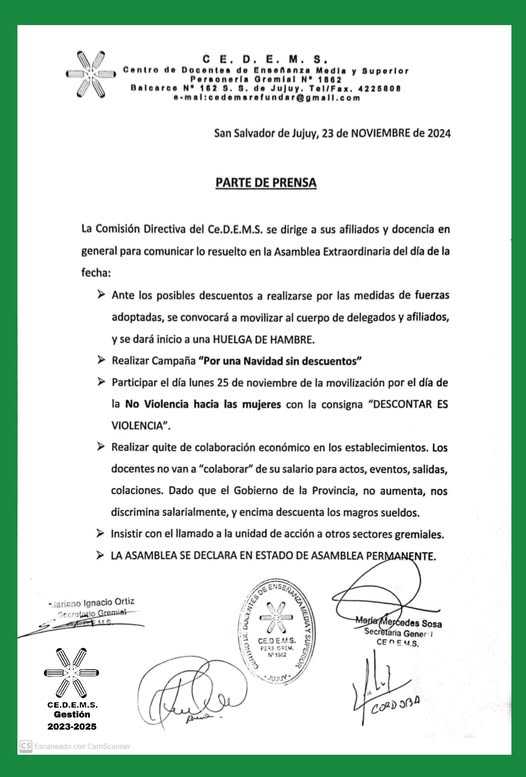 El conflicto salarial entre el CEDEMS y el Gobierno de Jujuy persiste desde hace meses, con el gremio denunciando aumentos insuficientes, falta de diálogo efectivo y políticas de ajuste que impactan negativamente en el sector educativo. “El gobierno nos discrimina salarialmente y, encima, descuenta los magros sueldos”, expresaron los dirigentes en el parte de prensa oficial.