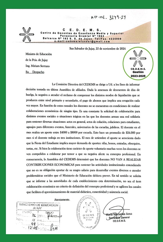 La Comisión Directiva del Ce.D.E.M.S. ha presentado una nota a la ministra de Educación, Ing. Miriam Serrano, en la que se expresa lo acordado en la última asamblea.