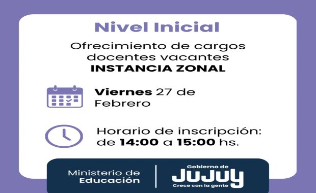 EL Ministerio de Educación, a través de la Dirección de Educación Inicial, comunica a la docencia, que el día viernes 27 de febrero de 2026, se llevará a cabo el ofrecimiento de cargos docentes vacantes para JI/JIN- Escuelas con Nivel Inicial Anexo, en las siete regiones educativas de la provincia.