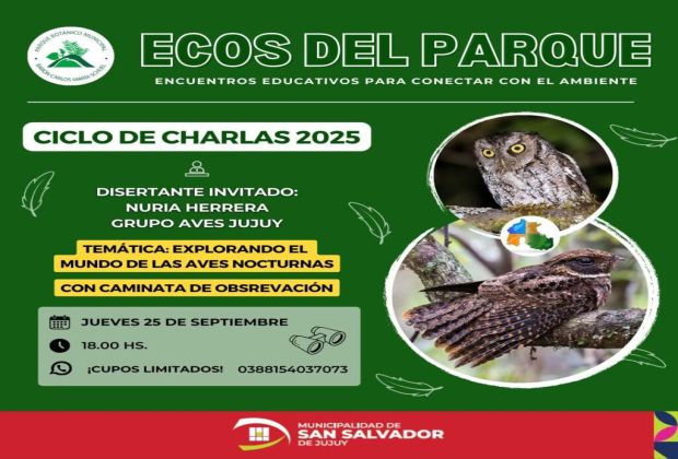 La Municipalidad de San Salvador de Jujuy, invita a la comunidad a participar del nuevo encuentro educativo “Ecos del Parque”, que en esta oportunidad abordará la fascinante charla “Explorando el mundo de las aves nocturnas” y se realizará el próximo jueves 25 de septiembre a las 18:00 hs. en el Parque Botánico Municipal.