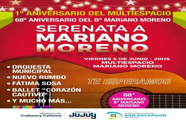 En el marco del 68° aniversario del barrio Mariano Moreno y el 1° aniversario del multiespacio Mariano Moreno, este viernes 6 de junio a las 20 hs. se celebrará una Serenata, con una destacada grilla artística y cultural abierta a todo el público.