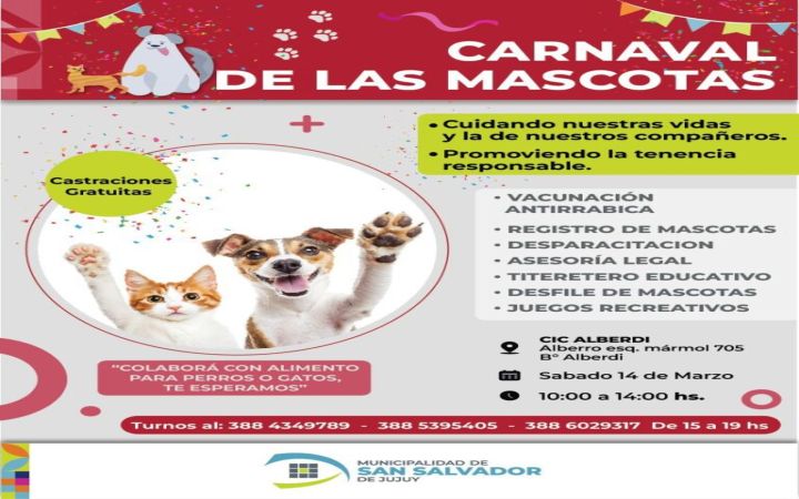 La Municipalidad invita a participar del Carnaval de las Mascotas, una jornada recreativa y solidaria que se realizará el sábado 14 de marzo en el CIC Alberdi, de 10 a 14 horas.
