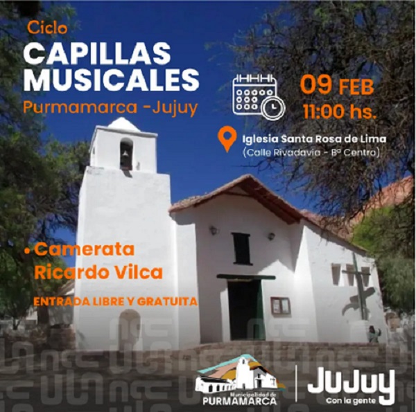 La Secretaría de Cultura anuncia que el próximo concierto tendrá lugar este domingo 9 de febrero a las 11:00 en la Capilla Santa Rosa de Lima, ubicada en Calle Rivadavia, barrio Centro de Purmamarca.