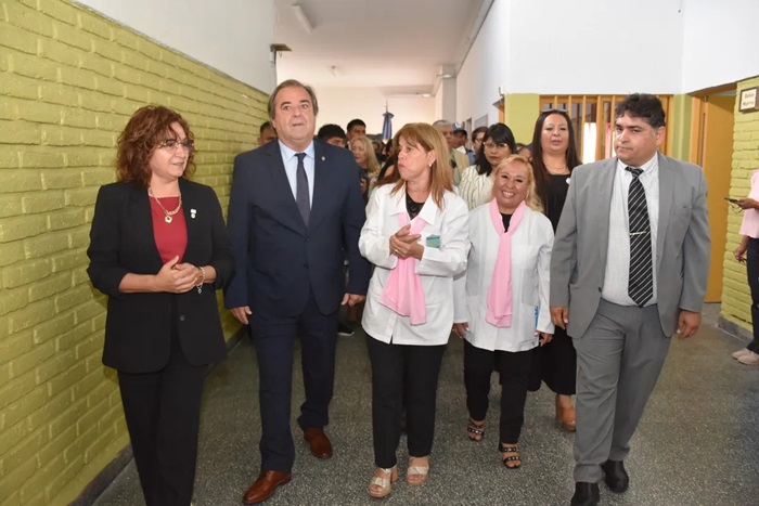 El vicegobernador Alberto Bernis, la ministra Miriam Serrano y el intendente Luciano Moreira encabezaron el acto que comenzó con el corte de cintas y el descubrimiento de una placa recordatoria junto a la presidente de la Comisión de Educación de la Legislatura, María Ferrín, y la directora del establecimiento, Claudia Dolsán.