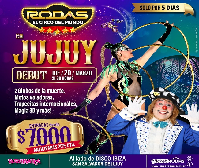 El circo llega a la Capital jujeña tras un exitoso fin de año en Santiago del Estero y una impresionante temporada de verano en Salta. Siendo la primera vez en el norte del país, con sus más de 40 años de trayectoria, el Rodas trae consigo entretenimiento de nivel mundial como los 2 globos de la muerte, motos voladoras, trapecistas internacionales y magia en 3D.