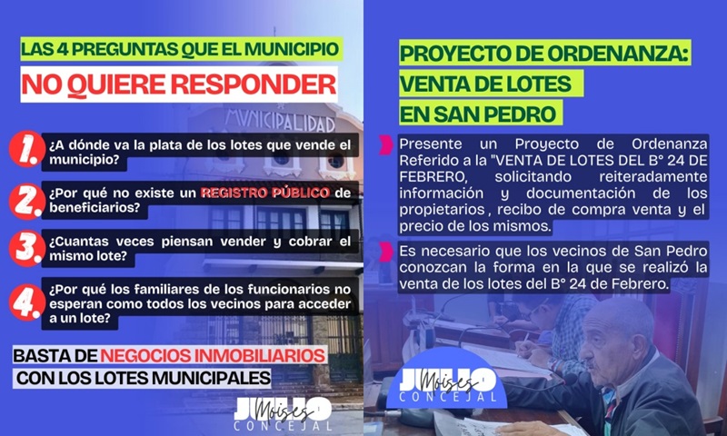 «Están haciendo ‘caja’ con la necesidad de la gente. En medio de una crisis económica asfixiante, el Municipio pretende quitar tierras a quienes no pueden construir por falta de recursos para volver a venderlas. Si las cosas se hacen bien, ¿por qué esconden la información?», cuestionó el edil.