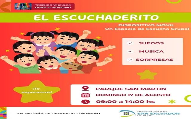 Este domingo 17 de agosto de 9 a 13 horas y en el marco de los Festejos por el Día del Niño, a desarrollarse en el Parque San Martín, se presentará por primera vez “El Escuchaderito Móvil, un espacio de escucha gruраl para niños, niñas у adolescentes quienes podrán expresarse libremente a través de dinámicas lúdicas, espacios para expresarse, usar la creatividad, compartir historias y divertirse.