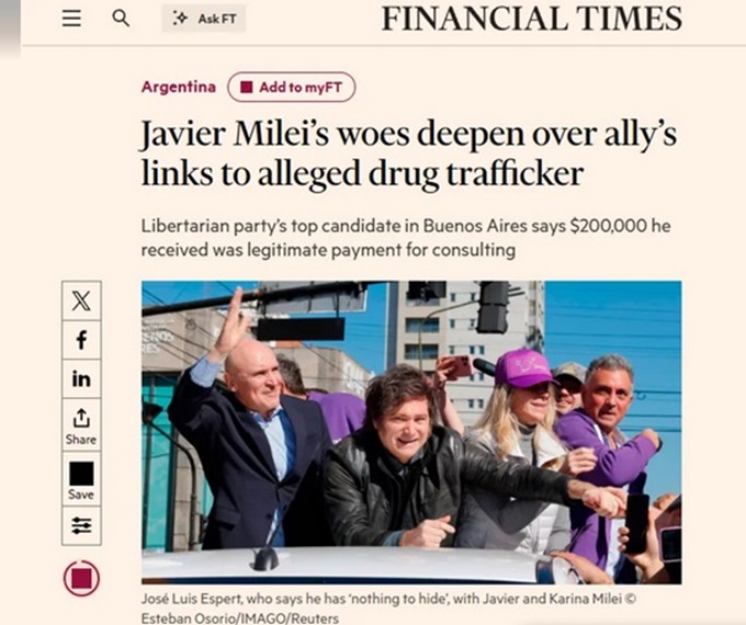 El prestigioso diario económico británico advirtió que “se profundizan los problemas” de Javier Milei por los vínculos de su candidato con un presunto narco.