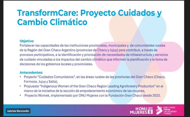 En reunión con la Oficial de la Oficina País de ONU Mujeres Argentina, Verónica Baracat, desde Jujuy se brindó información valiosa para el análisis situacional que permitirá la implementación de un proyecto que se desarrolla en el Gran Chaco para fortalecer las políticas de cuidado vinculadas al cambio climático y la garantía de derechos de mujeres.