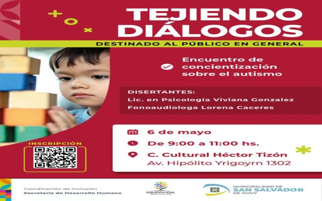 La Coordinación de Inclusión, invita a la comunidad a participar del encuentro “Tejiendo Diálogos”, una jornada de concientización sobre el autismo que se llevará a cabo el martes 6 de mayo, de 9 a 11 horas, en el Centro Cultural Héctor Tizón, ubicado en Hipólito Yrigoyen 1302.