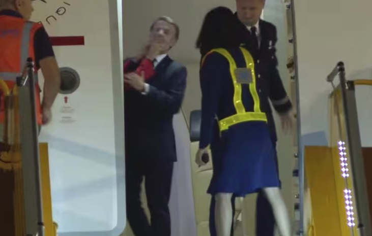 La pareja bajó las escaleras del avión, Macron tendió la mano a su esposa, como es su costumbre, pero ella no lo aceptó y se apoya en la baranda.