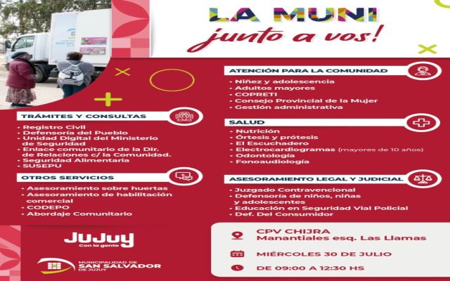 Las instalaciones del Centro de Participación Vecinal (CPV) del barrio Chijra, ubicado en la esquina de las calles Los Manantiales y Las Llamas, serán sede el miércoles 30 de julio, de 9:00 a 12:30, de una nueva jornada del programa municipal “La Muni junto a vos”, que se lleva adelante con el acompañamiento del Gobierno de la Provincia