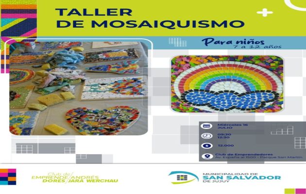 En las instalaciones del Club de Emprendedores del municipio capitalino, se dictará un taller de mosaiquismo destinado especialmente a niños de entre 7 y 12 años, con el objetivo de estimular su creatividad, expresión artística, diversión y aprendizaje durante las próximas vacaciones de invierno. Para más información, los interesados pueden acceder al formulario de inscripción en el siguiente enlace: https://forms.gle/7kYZSpp9tbPMX2LF9.
