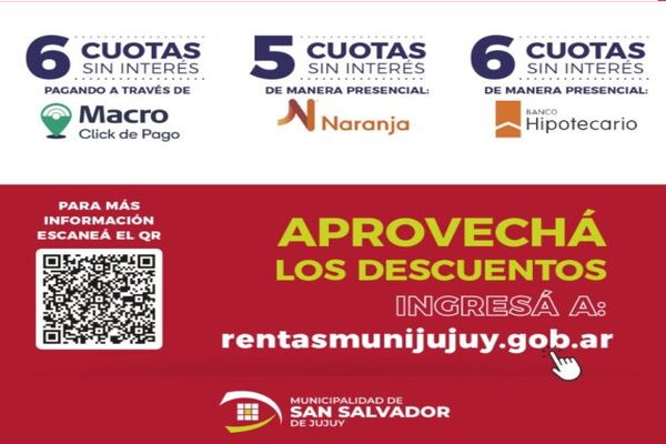 Desde la Dirección de Rentas municipal, recordaron que existen distintas posibilidades de pago a través de tarjetas de crédito, en la que se destaca la de hasta 6 cuotas sin interés del Banco Macro, mediante la página web www.rentasmunijujuy.gob.ar.