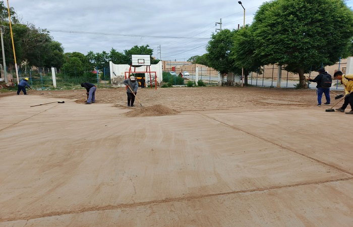 La acumulación de material que se encontró en los laterales de la cancha no es producto de las lluvias recientes sino de un desnivel en el ingreso de la misma, lo cual se va a resolver con el trabajo realizado con la máquina.