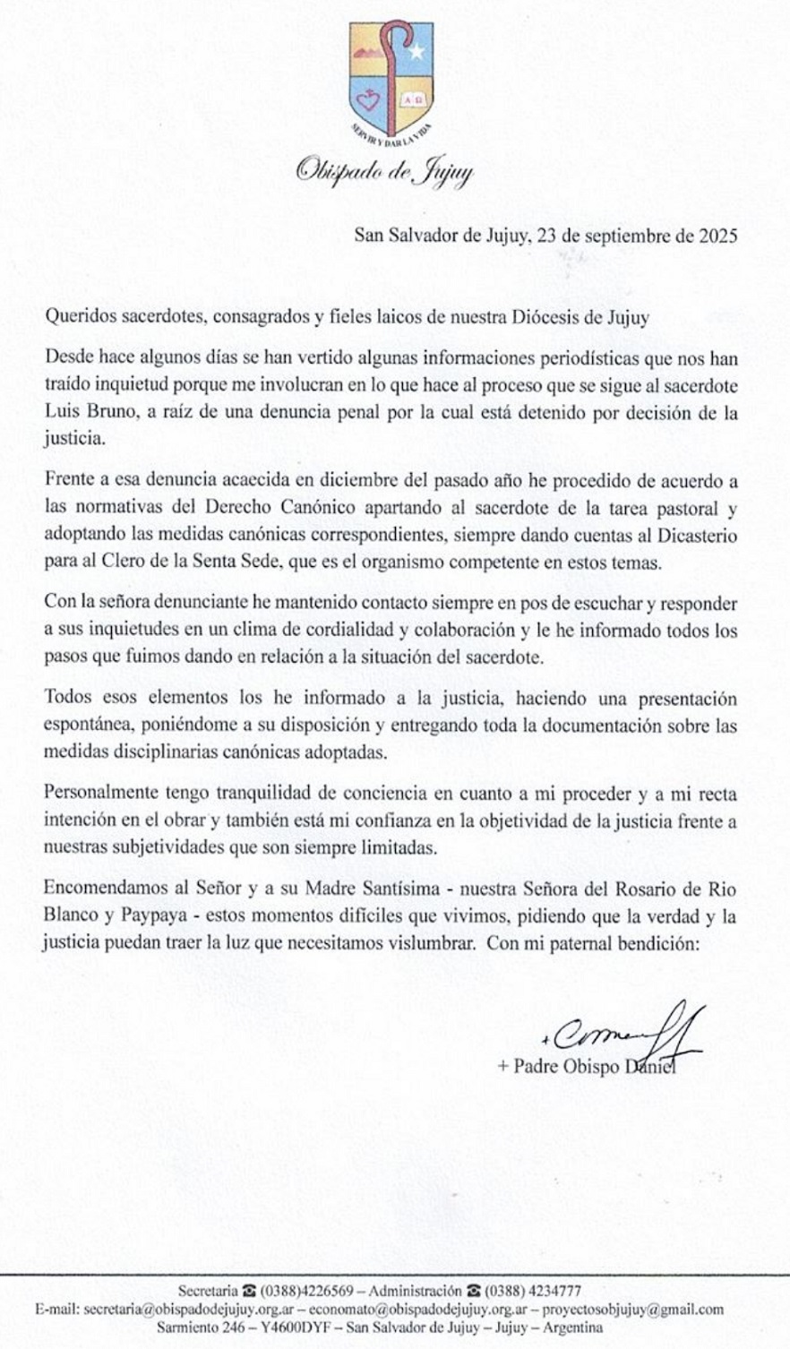 Por lo que, la Diócesis emitió un comunicado conocido anoche donde aclaran que “el Obispado de Jujuy se puso a disposición de las autoridades judiciales” y manifiesta “rotundo rechazo a todo tipo de violencia sexual, moral, psicológica o de conciencia hacia las personas que pastoralmente nos son encomendadas”.