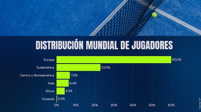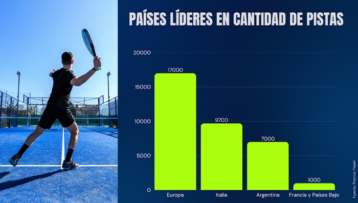 En las últimas décadas la expansión fue relativamente rápida. España lideró el desarrollo con más de 17.000 pistas, seguida por Italia con cerca de 9.700 instalaciones y Argentina con alrededor de 7.000. Datos de Premier Pádel indican que en un quinquenio se triplicó el número de países donde se practica, superando las 110 naciones. Europa concentra cerca del 60% de los jugadores; Francia y Países Bajos registraron crecimientos importantes y Reino Unido y Alemania suman en conjunto unas 800 instalaciones.