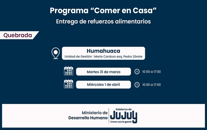 El Ministerio de Desarrollo Humano, por medio de la Secretaría de Asistencia Directa, informa que los días martes 31 de marzo y miércoles 1 de abril se llevará a cabo la entrega directa de módulos alimentarios para titulares del programa “Comer en Casa” de esta localidad quebradeña.