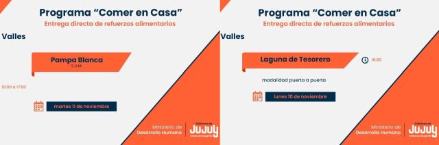 El Ministerio de Desarrollo Humano de Jujuy, mediante la Secretaría de Asistencia Directa, comunica que los días lunes 10 y martes 11 de noviembre, el equipo técnico del programa “Comer en Casa”, realizará el operativo de entrega directa de refuerzos alimentarios en Aguas Calientes, El Carmen, Laguna de Tesorero, Pampa Blanca, Puesto Viejo y Yala.