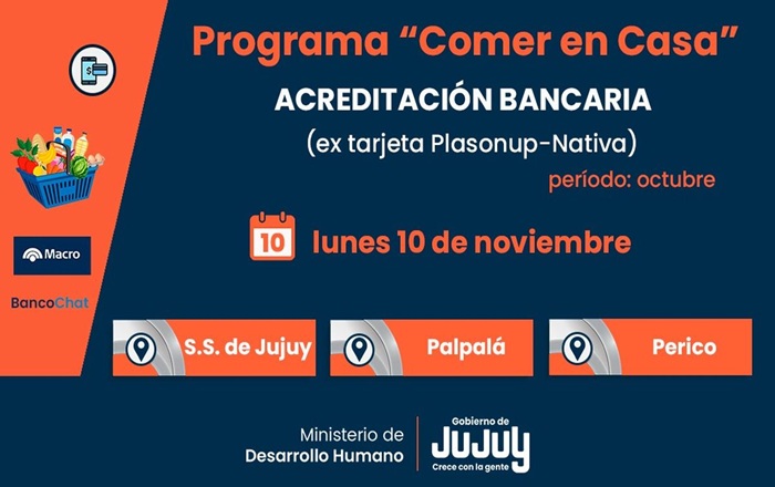 El Ministerio de Desarrollo Humano de Jujuy, a través de la Secretaría de Asistencia Directa, informa que este lunes 10 noviembre se concretó la acreditación bancaria del programa “Comer en Casa” correspondiente a octubre para titulares de San Salvador, Palpalá y Perico.