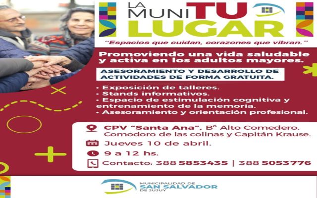 En las instalaciones del Centro de Participación Vecinal “Santa Ana” del barrio Alto Comedero, el jueves de 9 a 12, se cumplirá una nueva jornada del programa “La Muni Tu Lugar” destinado a los adultos mayores para la recreación y contención.