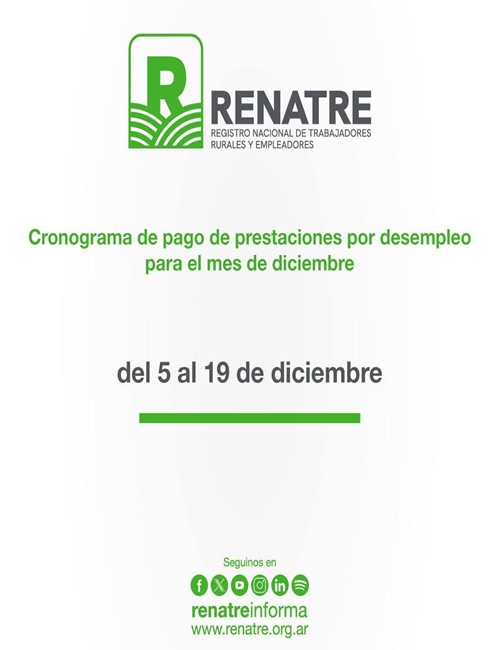 La Delegación Jujuy del Registro Nacional de Trabajadores Rurales y Empleadores (RENATRE) anunció que el cronograma de pago de la prestación por desempleo para trabajadores rurales se realizará del 5 al 19 de diciembre próximo.