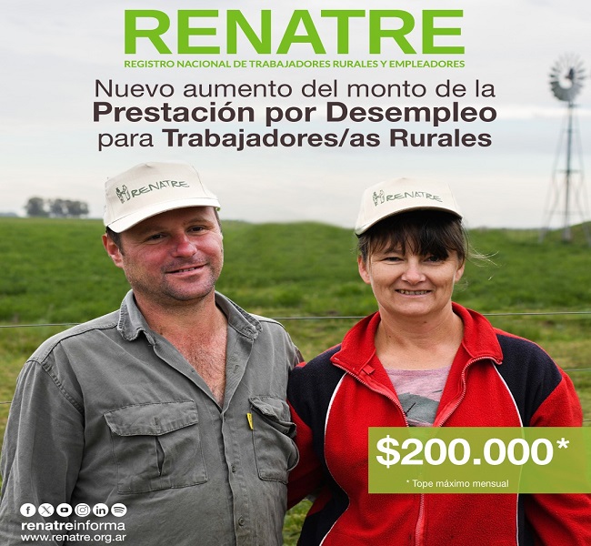 Al mismo tiempo señaló “los trabajadores rurales que estén en situación de desempleo y estén debidamente registrados en el RENATRE podrán acceder al Sistema Integral de Prestación por Desempleo”.